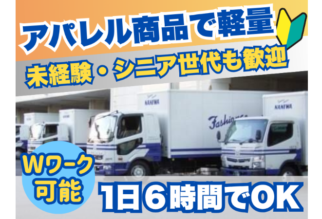《未経験歓迎◎履歴書不要》アパレル商品で軽量♪1日6時間でOK◎定年前後のシニアや女性も活躍中!Wワークも歓迎!