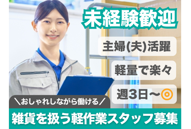 【未経験者大歓迎!】週3日からOK◎アパレル商品で軽量!簡単軽作業で主婦・主夫さんも活躍中◎
